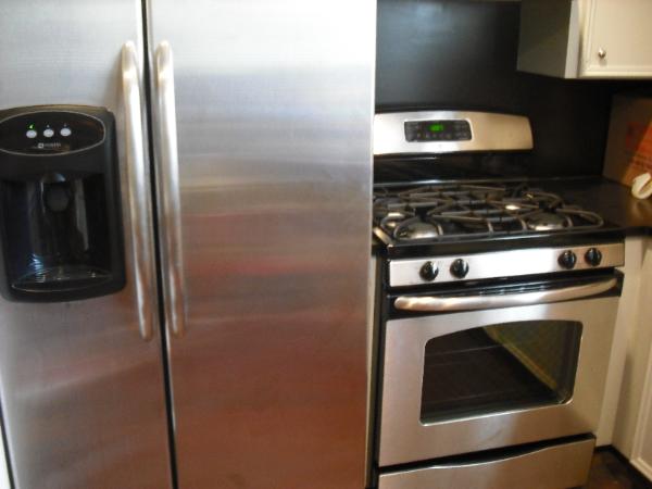B side- 100% hand troweled and stained concrete floors w/ no carpet, stainless double door frig w/ ice & water, stainless gas cooking, gas heat, central air (new outside unit in 2013), wood burning